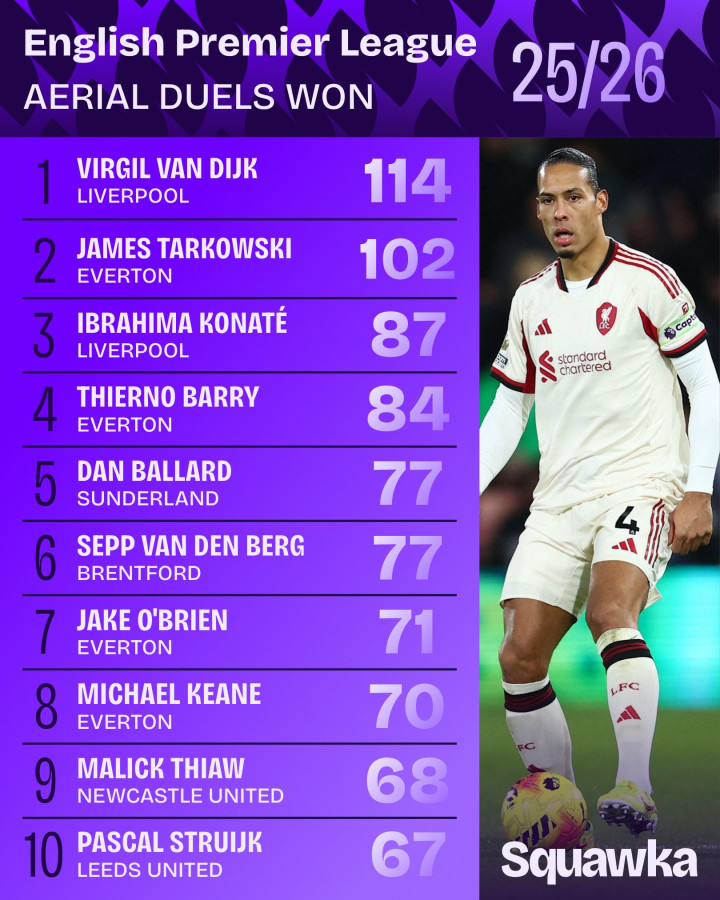 范戴克领衔本赛季英超空中对峙 成功次数和成功率双榜