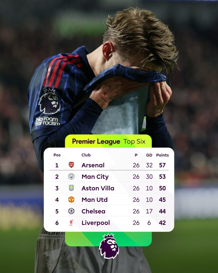 直播吧02月13日讯英超第26轮战罢,阿森纳本轮1-1战平布伦特福德,积分优势减少到4分。